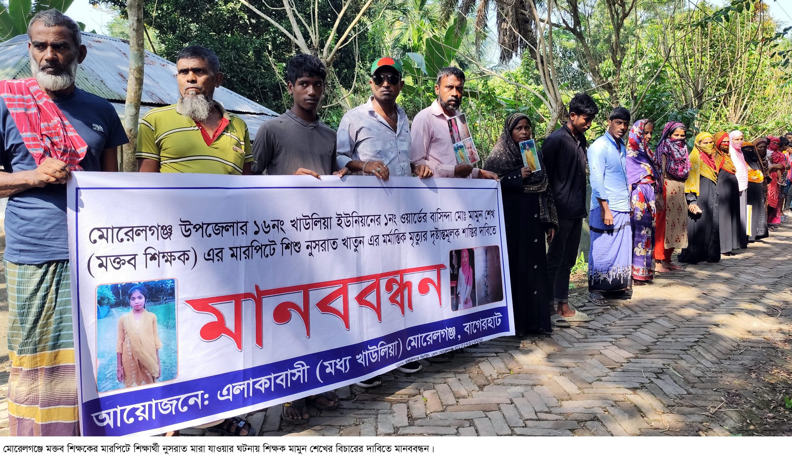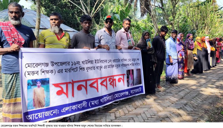 মোরেলগঞ্জ প্রতিনিধি:বাগেরহাটের মোরেলগঞ্জে মক্তব শিক্ষকের মারপিটে নুসরাত খাতুন (১১) নামে এক ছাত্রী মৃত্যুবরণ করেছে এমন অভিযোগে মানববন্ধন করেছেন ছাত্রীর পিতা-মাতাসহ শতাধিক গ্রামবাসি। রবিবার(৯ নভেম্বর) মধ্য খাউলিয়া গ্রামের মক্তবের সামনে সড়কে এ মানববন্ধন অনুষ্ঠিত হয়। মানববন্ধনে অংশ গ্রহনকারিরা মামলার আসামিদের দ্রুত গ্রেফতার ও দৃষ্টান্তমূলক বিচারের দাবি জানান।