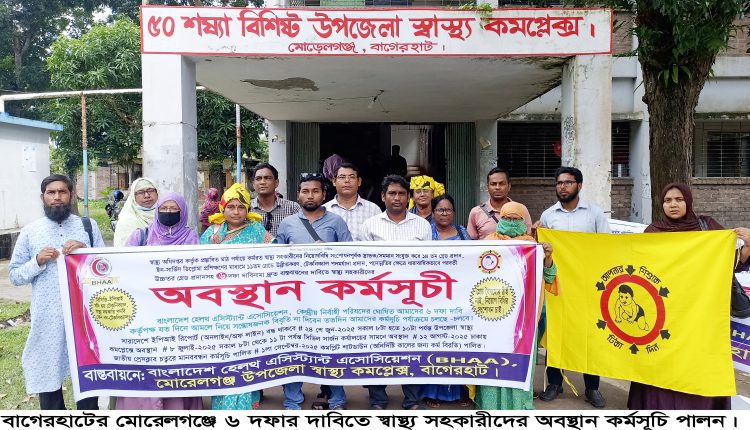 এ সময় বাগেরহাট জেলা হেলথ এ্যাসিস্ট্যান্ট এসোসিয়েশনের সাধারণ সম্পাদক কেএম মাসুদ হোসেন, স্বাস্থ্যকর্মী মো. জালাল হোসাইন, চায়না রানী সাহা, মেজবাউল হক, নূরেফা ভানু, নিলুফা ইয়াসমীন মিম, হুমায়ুন কবির বক্তৃতা করেন। বক্তারা অনতিবিলম্বে স্বাস্থ্য অধিদপ্তর কর্তৃক প্রস্তাবিত মাঠ পর্যায়ে কর্মরত স্বাস্থ্য সহকারীদের নিয়োগ বিধি সংশোধন পূর্বক স্নাতক/সমমান সংযুক্ত করে ১৪ তম গ্রেড প্রদান ইন-সার্ভিস ডিপ্লোমা প্রশিক্ষনের মাধ্যমে ১১ তম গ্রেডে উন্নীত করন, টেকনিক্যাল পদমর্যাদা প্রদান, পদন্নতির ক্ষেত্রে ধারাবাহিকভাবে পরবর্তী উচ্চতর গ্রেড প্রদানসহ ৬ দফার দাবি বাস্তবায়নের দাবি জানান। এ দাবি না মানা পর্যন্ত আন্দোলন কর্মসূচি অব্যাহত থাকবে বওেলও ঘোষণা করা হয়।