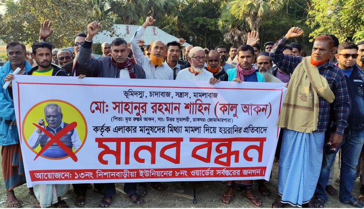তারা পাশর্^বতী বারইখালী ইউনিয়নের উত্তর সুতালড়ী গ্রামের শাহানুর রহমান শাহিন ওরফে কালু বিভিন্ন লোকের নামে ষড়যন্ত্রমূলক মিথ্যা মামলা দিয়ে হয়রানি করছে এমন অভিযোগে ভূক্তভোগীরা এ কর্মসূচি পালন করেন। মানববন্ধনে অংশ গ্রহনকারিরা কালুর দায়ের করা ‘মিথ্যা মামলা’ প্রত্যাহরের দাবি জানান।