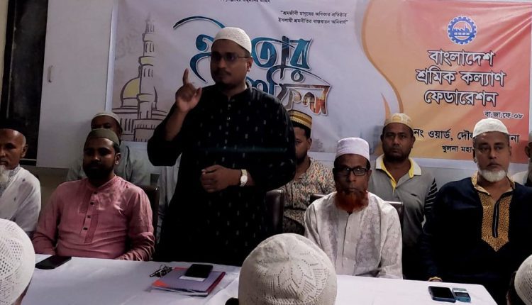 বাংলাদেশ শ্রমিক কল্যাণ ফেডারেশনের খুলনা মহানগরী সভাপতি মু. আজিজুল ইসলাম ফরাজী বলেছেন, শ্রমিক কল্যাণ ফেডারেশন শ্রমজীবী মানুষের অধিকার প্রতিষ্ঠায় গুরুত্বপূর্ণ ভূমিকা রেখে চলেছে। পবিত্র রমযান আত্মশুদ্ধি ও সংযমের মাস। এই মাসে শ্রমিকদের উচিত নিজেদের নৈতিকতা ও কর্মসংস্কৃতির উন্নয়ন ঘটানো। রমযান ধৈর্য, ত্যাগ ও ঐক্যের শিক্ষা দেয়, যা শ্রমিকদের অধিকার আদায়ে অনুপ্রেরণা যোগায়। তিনি আরও বলেন, শ্রমিকদের ন্যায্য মজুরি, নিরাপদ কর্মপরিবেশ এবং সামাজিক নিরাপত্তা নিশ্চিত করতে সবাইকে ঐক্যবদ্ধভাবে কাজ করতে হবে। রোববার (১৬ মার্চ) খুলনা মহানগরীর দৌলতপুর থানাধীন ৩নং ওয়ার্ড শ্রমিক কল্যাণ ফেডারেশনের উদ্যোগে মহেশ্বরপাশা কালিবাড়ী বাজারস্থ দৌলতপুর আলিয়া মাদরাসা প্রাঙ্গনে ইফতার মাহফিলে প্রধান অতিথির বক্তৃতায় তিনি এ সব কথা বলেন।ওয়ার্ড সভাপতি মো. গোলাম মোস্তফার সভাপতিত্বে ও শেখ শিহাব উদ্দিন এর পরিচালনায় ইফতার মাহফিলে বিশেষ অতিথি ছিলেন বাংলাদেশ শ্রমিক কল্যাণ ফেডারেশন খুলনা মহানগরীর অফিস সম্পাদক আল-হাফিজ সোহাগ, দৌলতপুর থানা সভাপতি মো. রফিকুল ইসলাম, সাধারণ সম্পাদক খান মাহবুবুর রহমান জুনাই, জামায়াতে ইসলামী ৩নং ওয়ার্ড সভাপতি মো. গোলাম কিবরিয়া ও ইস্পাহানি ইউনিটের সভাপতি মুজাহিদুল ইসলাম। অন্যান্যদের মধ্যে ইলেক্ট্রেশিয়ান ট্রেড ইউনিয়নের সভাপতি আব্দুল মালেক মুন্সি, নির্মাণ শ্রমিক ইউনিয়ন এর সভাপতি মো. দবির উদ্দিন মোল্যা ও শ্রমিকনেতা কামরুল ইসলাম, আব্দুল হাকিম, তাজমুল ইসলাম, মো. রফিকুল ইসলাম-২, আরিফ হোসেন, ডুহিন, কামরুল ইসলাম, আবুল হোসেন প্রমুখ নেতৃবৃন্দ উপস্থিত ছিলেন।