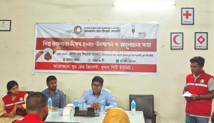 বাংলাদেশ রেড ক্রিসেন্ট সোসাইটি, খুলনা সিটি ইউনিটের উদ্যোগে বিশ্ব রক্তদাতা দিবস – ২০২৫ উদযাপন ও আলোচনা সভা খুলনা সিটি রেড ক্রিসেন্ট ইউনিট অফিসে আয়োজন করা হয়।