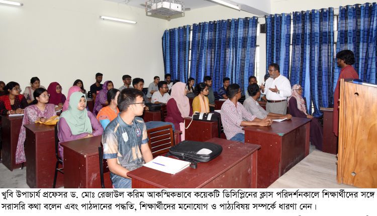 খুলনা বিশ্ববিদ্যালয়ের উপাচার্য প্রফেসর ড. মোঃ রেজাউল করিম আজ ২১ এপ্রিল (সোমবার) বেলা সাড়ে ১১টার দিকে আকস্মিকভাবে ইতিহাস ও সভ্যতা ডিসিপ্লিন এবং ইংরেজি ডিসিপ্লিনের কয়েকটি ক্লাস পরিদর্শন করেন। এসময় তিনি ক্লাসে উপস্থিত শিক্ষার্থীদের সঙ্গে সরাসরি কথা বলেন এবং পাঠদানের পদ্ধতি, শিক্ষার্থীদের মনোযোগ ও পাঠ্যবিষয় সম্পর্কে ধারণা নেন।