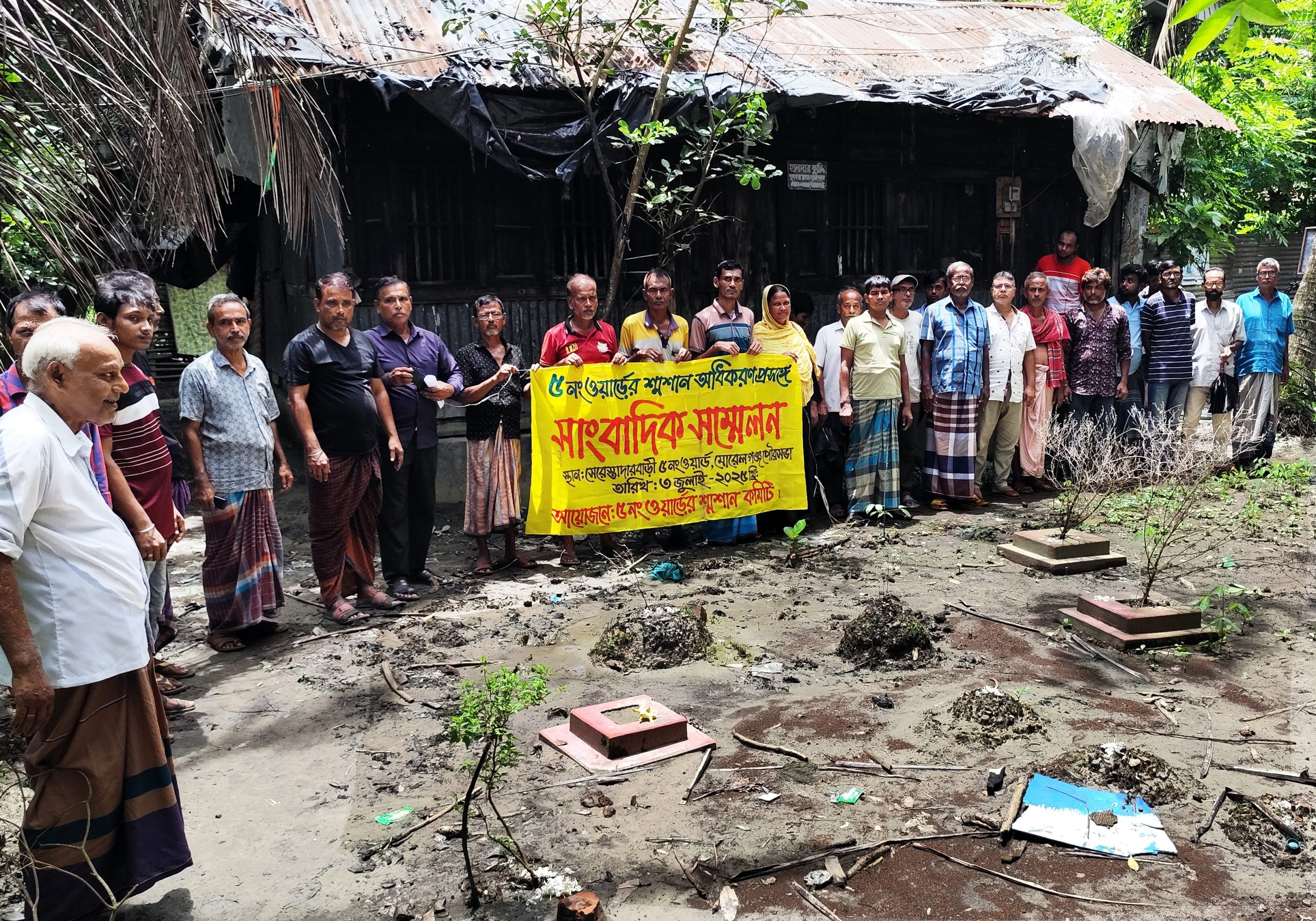 মোরেলগঞ্জ প্রতিনিধি:বাগেরহাটের মোরেলগঞ্জে সনাতন ধর্মাবলম্বীদের মধ্যে কেউ মৃত্যুবরণ করলে তার শেষ কৃত্য সম্পন্ন করার জন্য নির্ধারিত স্থান ‘শ্মশান ঘাট’ দখল করে বসতি নির্মাণ ও বিক্রির অভিযোগ উঠেছে। বৃহস্পতিবার বেলা ১১ টার দিকে মোরেলগঞ্জ পৌরসভার ৫ নং ওয়ার্ডের সেরেস্তাদারবাড়ি এলাকার শ্মশানঘাটটি নিয়ে এমন অভিযোগ তুলেছেন স্থানীয় সনাতন ধর্মাবলম্বীরা। এ ঘটনার প্রতিবাদে ও শ্মশানের জমি দখলমুক্ত করার দাবিতে স্থানীয় বাসিন্দারা শ্মশানঘাট এলাকায় বিক্ষোভ সমাবেশ করেছেন। একই সাথে তারা সাংবাদিক সম্মেলনও করেন।