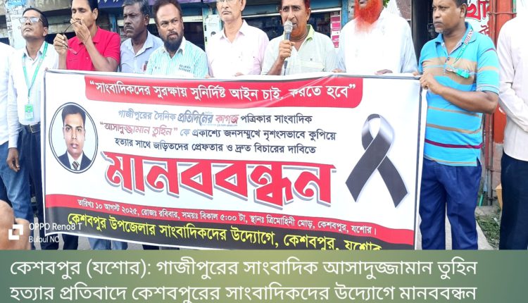 ঢাকার গাজীপুরে প্রতিদিনের কাগজ পত্রিকার সাংবাদিক আসাদুজ্জামান তুহিন হত্যার প্রতিবাদে যশোরের কেশবপুরে সাংবাদিকদের উদ্যোগে মানববন্ধন অনুষ্ঠিত হয়েছে।