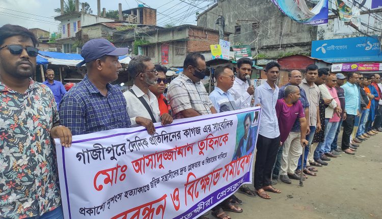 শনিবার (৯ আগস্ট) গাজীপুরে সাংবাদিক আসাদুজ্জামান তুহিনকে কুপিয়ে হত্যার ঘটনায় সাতক্ষীরা নিউ মার্কেট মোড়স্থ শহীদ স. ম আলাউদ্দীন চত্বরে সাতক্ষীরা প্রেসক্লাব আয়োজিত মানববন্ধন ও বিক্ষোভ সমাবেশে বক্তারা এসব কথা বলেন।