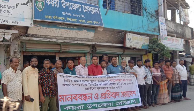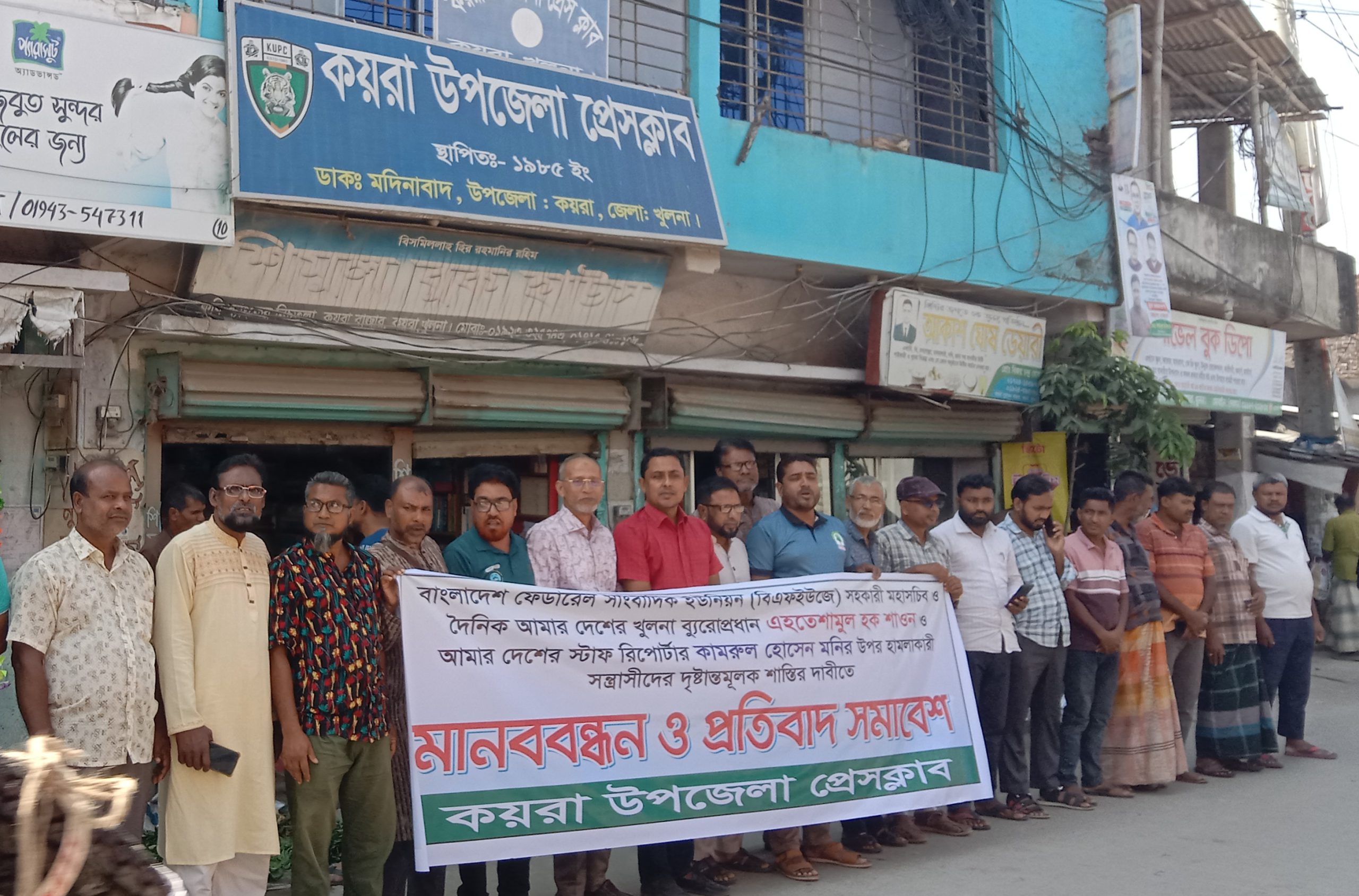 সাংবাদিক শাওন ও মনির উপর সন্ত্রাসী হামলার প্রতিবাদে কয়রায় মানববন্ধন