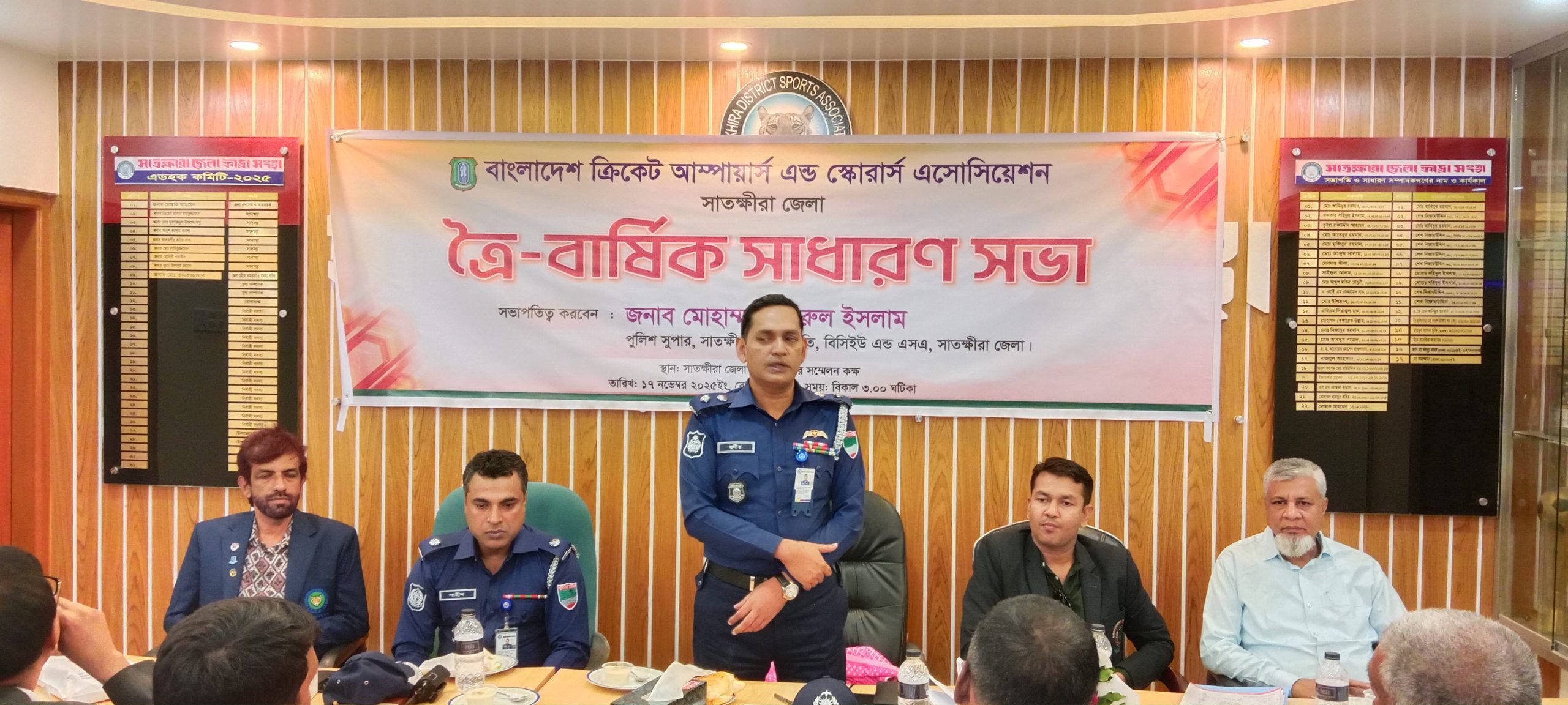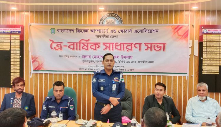 সোমবার (১৭ নভেম্বর) সাতক্ষীরা জেলা স্টেডিয়ামের সম্মেলন কক্ষে জেলা ক্রিকেট আম্পায়ার্স এন্ড স্কোরার্স এসোসিয়েশনের ত্রৈ-বার্ষিক সাধারণ সভায় সভাপতিত্ব করেন সংগঠনটির সভাপতি ও পুলিশ সুপার মো.মনিরুল ইসলাম।