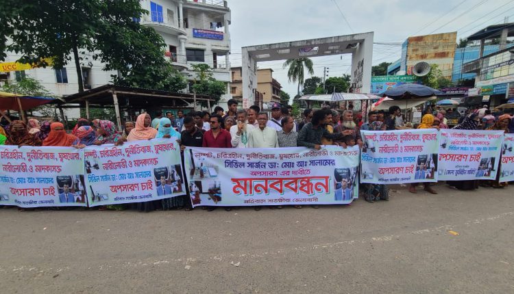 সোমবার সকাল ১১টায় সাতক্ষীরা শহরের খুলনা মোড়ে সাতক্ষীরা জেলাবাসীর ব্যানারে আয়োজিত এ মানববন্ধনে অংশ নেন জেলার বিভিন্ন রাজনৈতিক, সামাজিক ও পেশাজীবী সংগঠনের নেতা-কর্মী, শ্রমজীবী মানুষ ও ভুক্তভোগী সাধারণ রোগীরা।