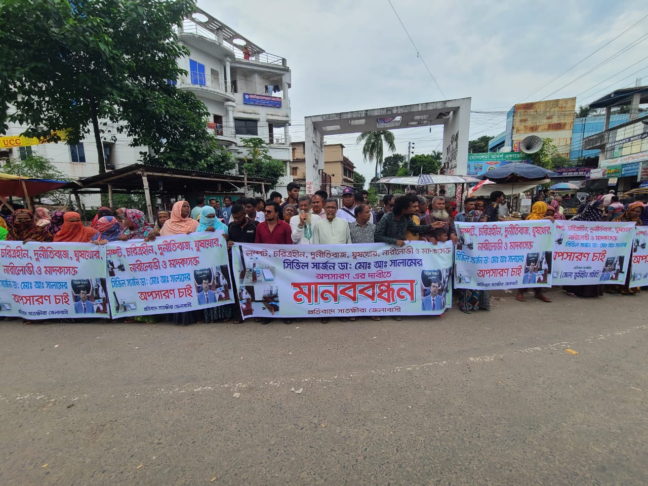 মানববন্ধন শেষে অংশগ্রহণকারীরা বিক্ষোভ মিছিল করে সিভিল সার্জন অফিসের সামনে গিয়ে অবস্থান নেয়। এসময় “দুর্নীতিবাজ সিভিল সার্জনের অপসারণ চাই”, “নারী নির্যাতনকারীর বিচার চাই”, “সাতক্ষীরার স্বাস্থ্য প্রশাসন বাঁচাও” ইত্যাদি শ্লোগানে মুখর হয়ে ওঠে।