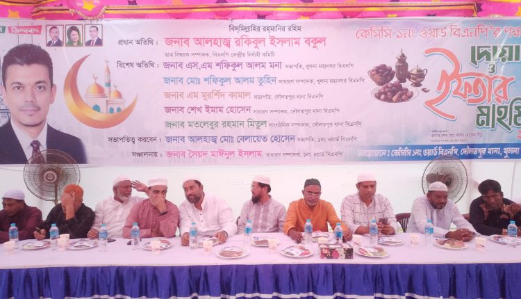 দৌলতপুর থানা বিএনপির অন্তর্ভুক্ত ১নং ওয়ার্ড বিএনপির উদ্যোগে বুধবার (১৯ মার্চ) মানিকতলা শহীদ জিয়া কলেজ চত্বরে ইফতার মাহফিল ও দোয়া মোনাজাত অনুষ্ঠিত হয়। ১ নং ওয়ার্ড বিএনপি’র সভাপতি আলহাজ্ব মো. বেলায়েত হোসেনের সভাপতিত্বে ও সাঃ সম্পাদক মো. মাইনুল ইসলামের সঞ্চালনায় সভার প্রধান অতিথি ছিলেন খুলনা মহানগর বিএনপির সভাপতি এ্যাড. এস.এম শফিকুল আলম মনা। বিশেষ অতিথি ছিলেন খুলনা মহানগর বিএনপির সাঃ সম্পাদক মো. শফিকুল আলম তুহিন, দৌলতপুর থানা বিএনপির সভাপতি এম মুর্শিদ কামাল, সাঃ সম্পাদক শেখ ইমাম হোসেন, সাংগঠনিক সম্পাদক মতলেবুর রহমান মিতুল। এ সময় আরো উপস্থিত ছিলেন, ২ নং ওয়ার্ড বিএনপির সভাপতি মোঃ মিজানুর রহমান মিজান, ৩ নং ওয়ার্ড বিএনপির সভাপতি মো. হুমায়ুন কবির, ৫নং ওয়ার্ড বিএনপির সভাপতি মো. খবির উদ্দিন, ৬ নং ওয়ার্ড বিএনপির সভাপতি জয়নাল আবেদীন, নগর যুবদলের সাবেক সভাপতি কাজী নেহিবুল হাসান নেইম, ৬নং ওয়ার্ড বিএনপির সাঃ সম্পাদক শেখ আনসার আলী, ২ নং ওয়ার্ড বিএনপির সাঃ সম্পাদক মো. রফিকুল ইসলাম, ৩ নং ওয়ার্ড বিএনপির সাঃ সম্পাদক রাকিবুল ইসলাম মিঠু, আড়ংঘাটা ইউনিয়ন বিএনপির সাঃ সম্পাদক রাসেলুজ্জামান রাসেল, ১ নং ওয়ার্ড বিএনপির সাংগঠনিক সম্পাদক শেখ কবির হোসেন টিটোসহ ৩নং ওয়ার্ড বিএনপির নেতৃবৃন্দ, বিএনপির অঙ্গ সংগঠনের নেতৃবৃন্দ উপস্থিত ছিলেন।